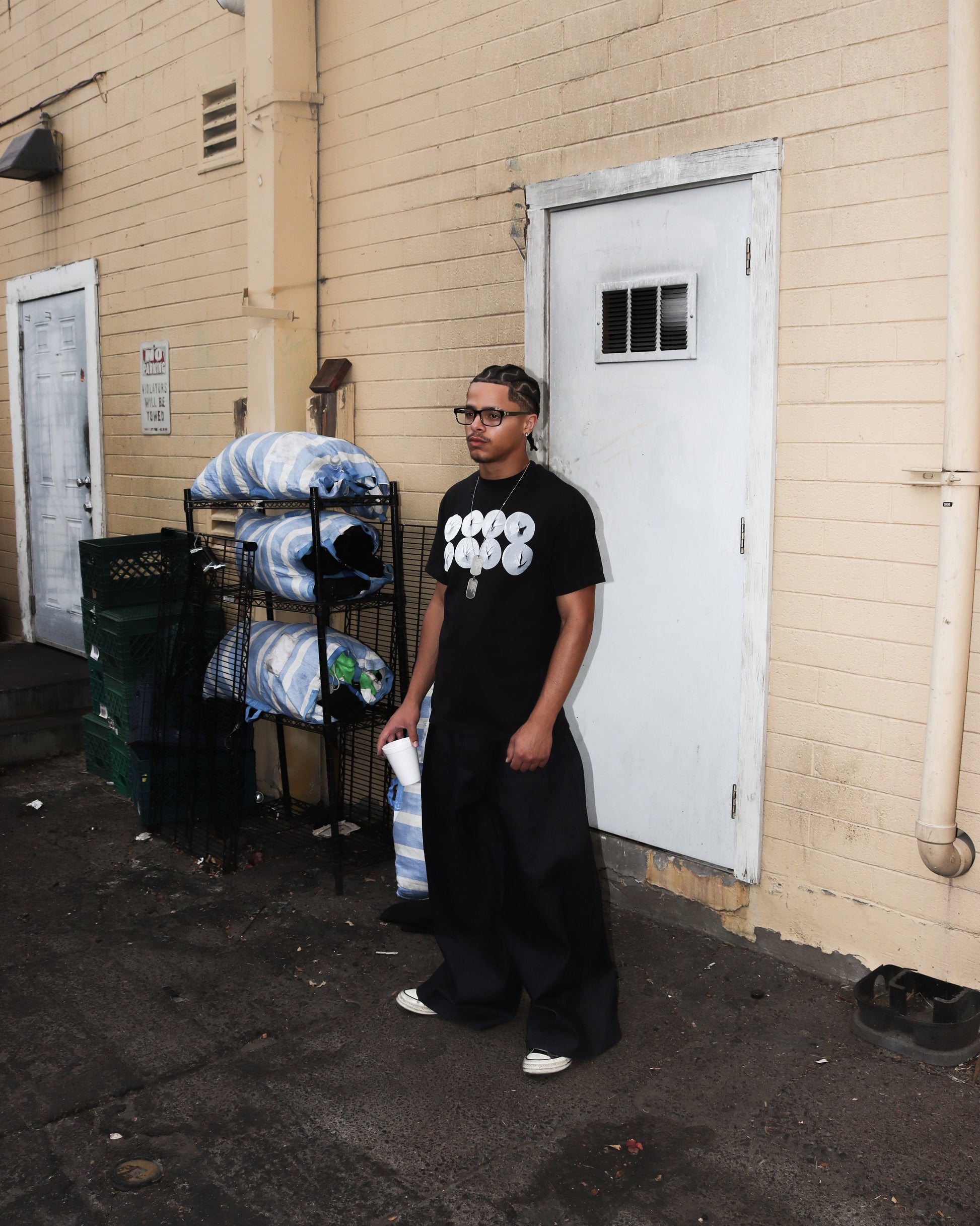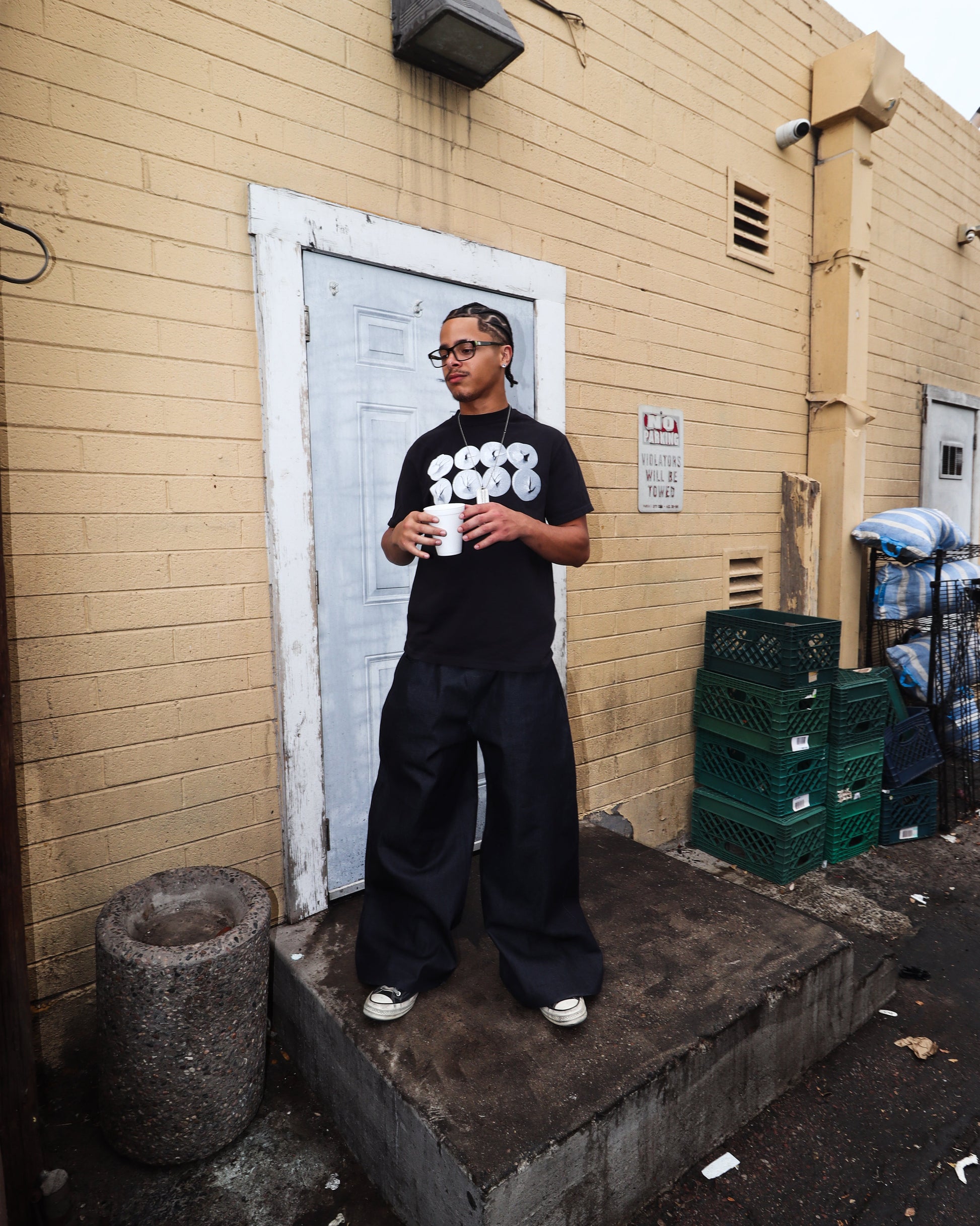 Black tee shirt with White screen printed dollops.